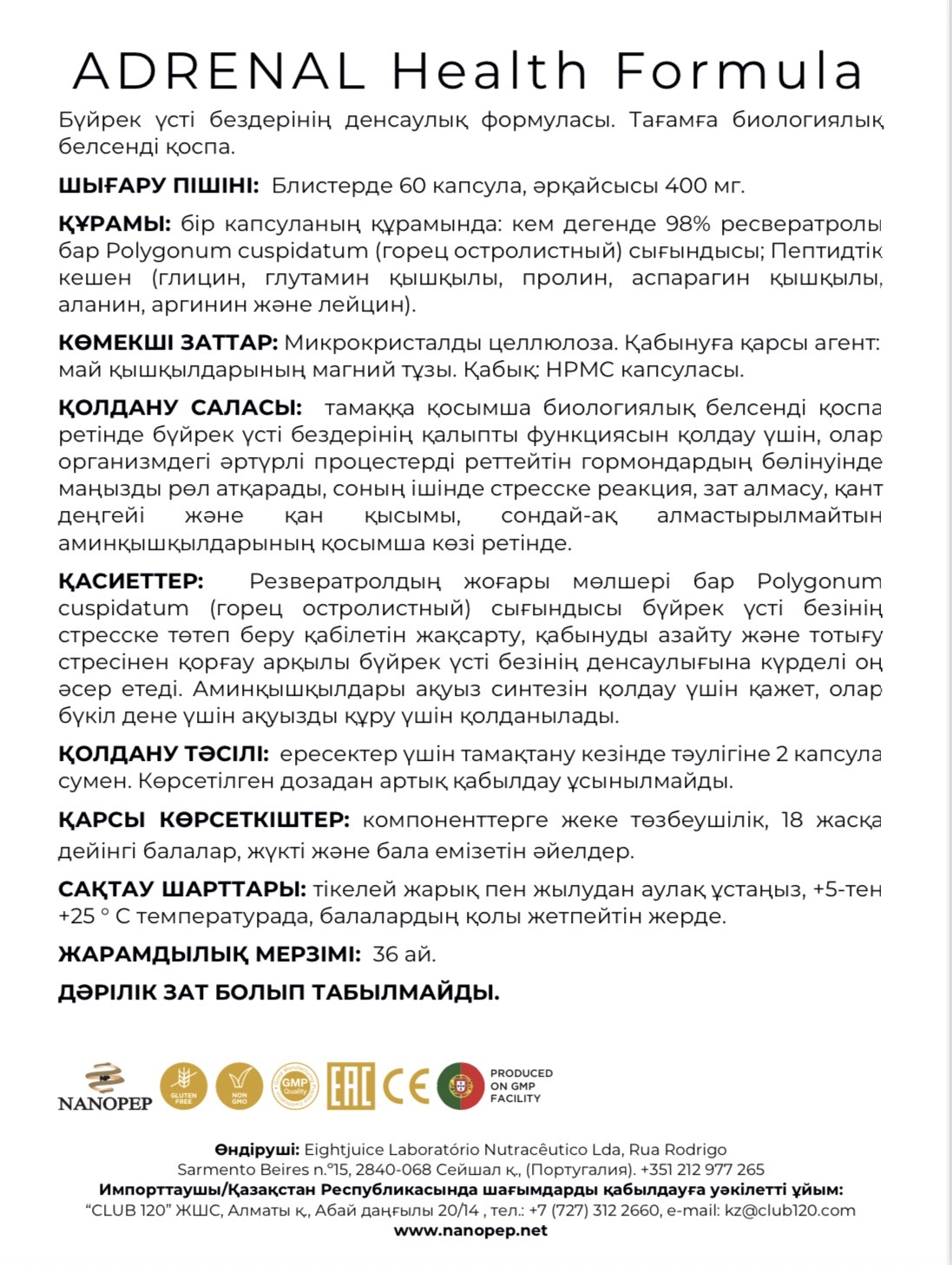 ADRENAL Health Formula® (АДРЕНАЛ Формула Здоровья) — это биологически активная добавка от Nanopep, созданная для восстановления работы надпочечников, повышения стрессоустойчивости, нормализации гормонального баланса (в т.ч. кортизола) и борьбы с хронической усталостью. Пептидный комплекс и ресвератрол в составе помогают при эмоциональном выгорании, упадке энергии и нарушениях сна.