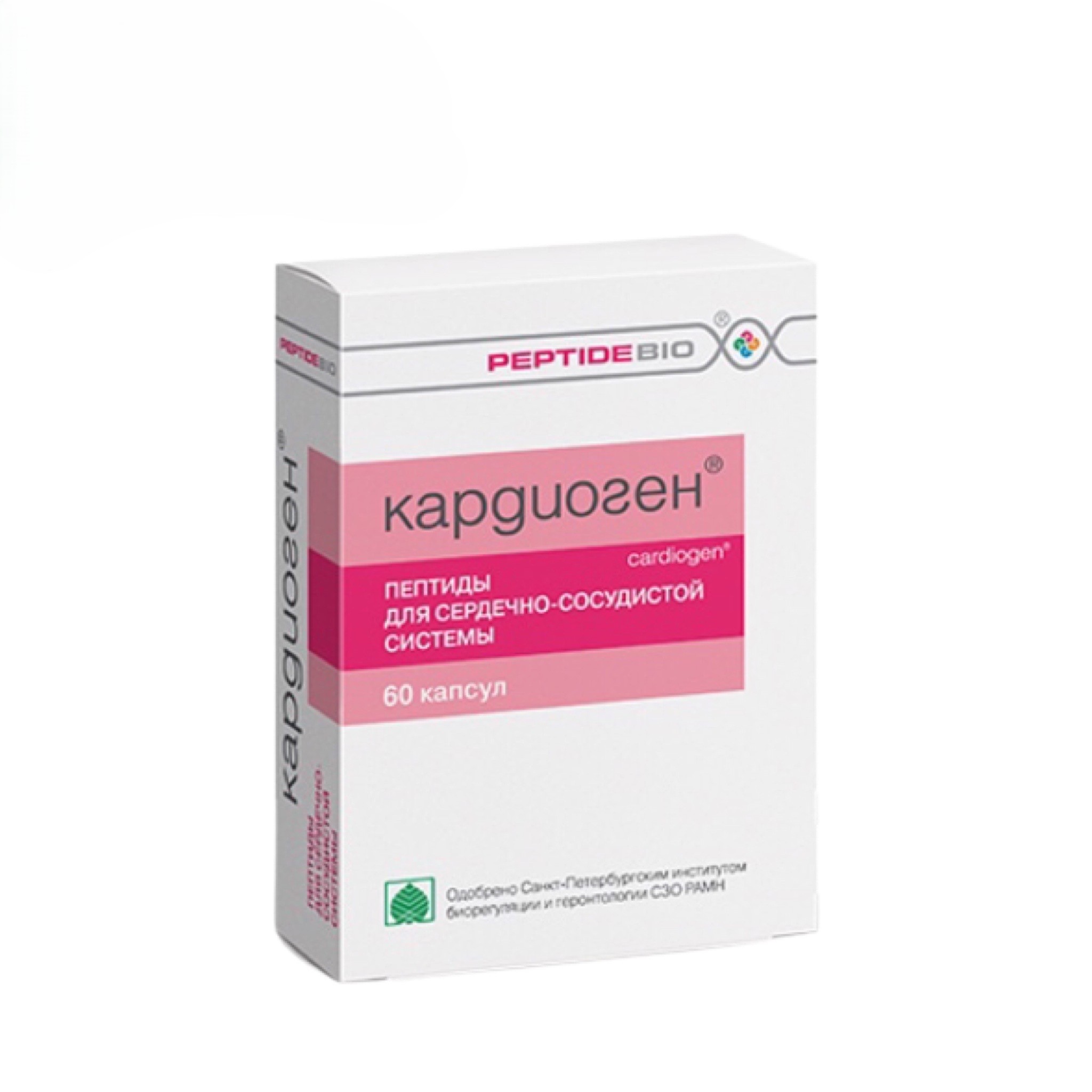 Растущее количество заболеваний в области сердца и сосудов - одна из главных проблем человечества. Несмотря на улучшение уровня диагностики, смертность по ним не снижается. Ученые связывают это с наследственными факторами и с растущим уровнем нагрузок на организм, вызываемых жизнью в условиях больших городов. Поскольку глобализация развивается большими темпами, адаптационные возможности людей не поспевают за этим процессом. Повысить ресурсы своего организма можно с уникальной биологически активной добавкой - пептидами Кардиоген. Практика традиционной терапии и купирования симптомов болезней сердечно-сосудистой системы нитроглицериновыми препаратами уходит в прошлое. Люди хотят не просто снимать симптомы проявления неизлечимых болезней, но кардинально улучшать работу сердца, продлевая его жизнь и избавляясь от причин возникновения заболеваний. Короткие пептиды для сердечно-сосудистой системы используются в составе комплексного лечения патологий сердца и сосудов. Отмечена высокая сочетаемость препаратов со всеми лекарственными средствами и продуктами питания, поскольку они действуют на клеточном уровне, в отличие от других лекарств и БАД. Курс приема пептидов Кардиогена, необходимо применять людям, начиная со среднего возраста, с целью предупреждения заболеваний сердца и сосудов, а также в комплексном лечении уже имеющихся проблем со здоровьем. Кардиоген препарат, требующий особенного внимания врачей, поскольку является действительно эффективным общеукрепляющим средством для профилактического и терапевтического приема в дополнение к традиционным средствам лечения сердца. Влияние пептидов на способности организма к восстановлению - часть научных работ крупного значения во многих странах мира. Не лечить симптомы, а бороться с причинами - вот секрет того, как можно победить болезнь. С Кардиогеном можно применять Нормофтал пептиды для зрения. Кардиоген может применяться абсолютно здоровыми людьми для предупреждения заболеваний сердца в группах риска: наследственность условия жизни и работы с целью повышения выносливости организма при усиленных нагрузках в борьбе с неблагоприятными факторами внешней среды спортсмены подводники практики профессий, связанных с высоким риском интоксикации организма жителям Северных районов Действие улучшает снабжение тканей кислородом и полезными веществами обновляет клетки сосудов и сердца повышает выносливость сердца повышает адаптивность организма к внешней среде качественно улучшает эластичность тканей сердца увеличивает устойчивость сердечной мышцы перед осложнениями после вирусных инфекций повышает выносливость организма к перегрузкам физического и эмоционального характера Рекомендован ишемическая болезнь сердца гипертоническая болезнь миокардиты постинфарктный кардиосклероз миокардиодистрофии различного генеза сердечная недостаточность инфаркт "миокарда" ишемия гипертонический криз хроническая сердечная недостаточность приступы стенокардии Годен до: Форма выпуска: 60 капсул (упаковка).