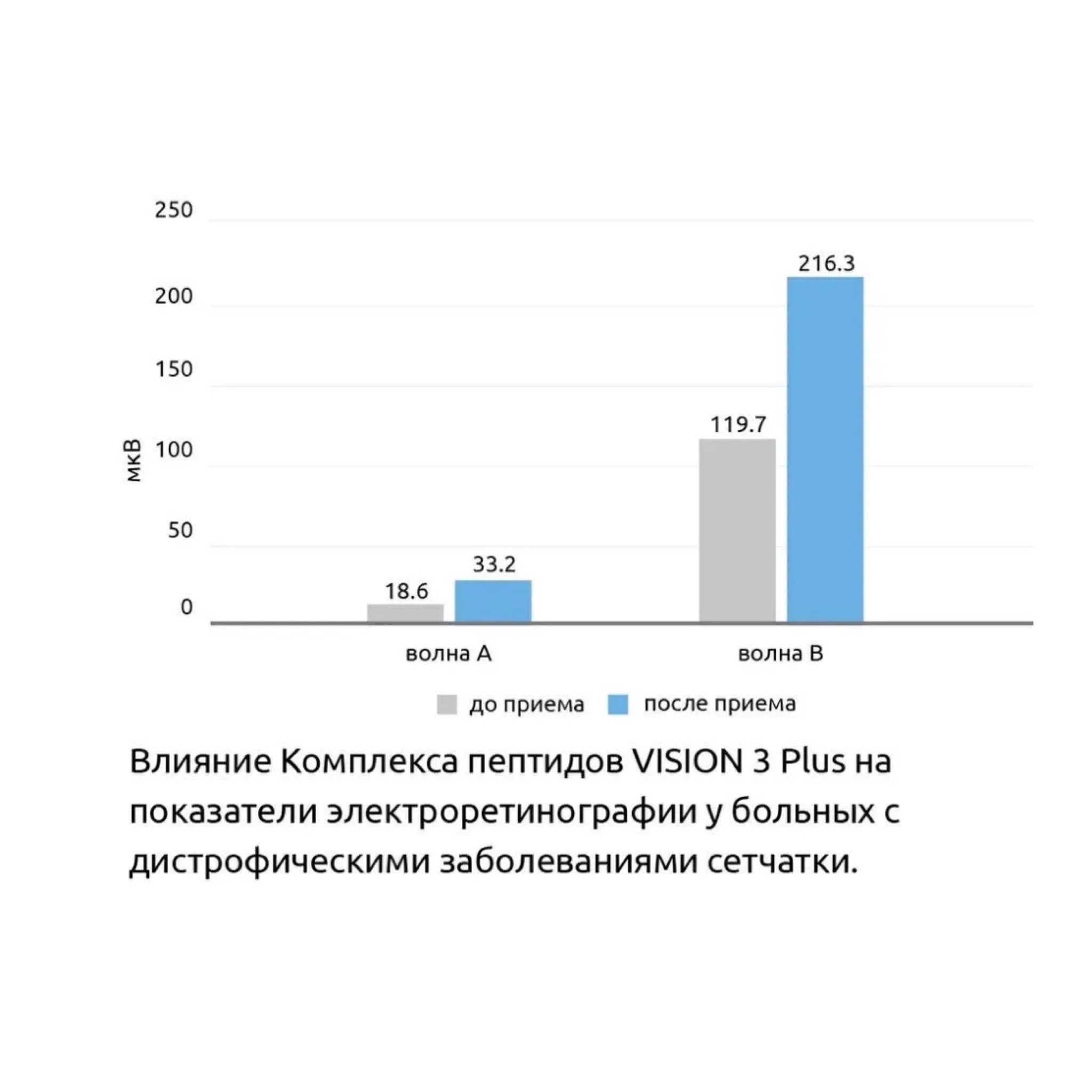 Клиническое испытание пептидного комплекса VISION 3 Plus® проводили у больных с дистрофическими заболеваниями сетчатки глаза различной этиологии и посттравматическими эндотелиально-эпителиальными дистрофиями роговицы. В результате проведенных исследований установлено, что в случае применения дополнительно к общепринятому лечению наблюдался максимальный лечебный эффект у больных с начальными стадиями дистрофических изменений сетчатки. Это проявлялось в повышении остроты зрения, а также в улучшении электрофизиологических показателей сетчатки, результатов флюоресцентной ангиографии и изменении полей зрения.